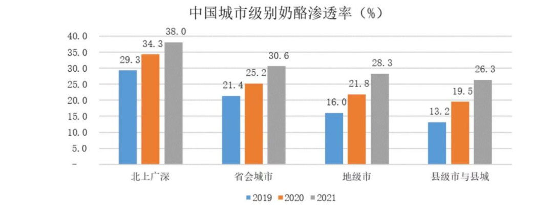 凯度消费数据也显示,地级市、县级市与县城奶酪产品的渗透率已逐步接近省会城市。