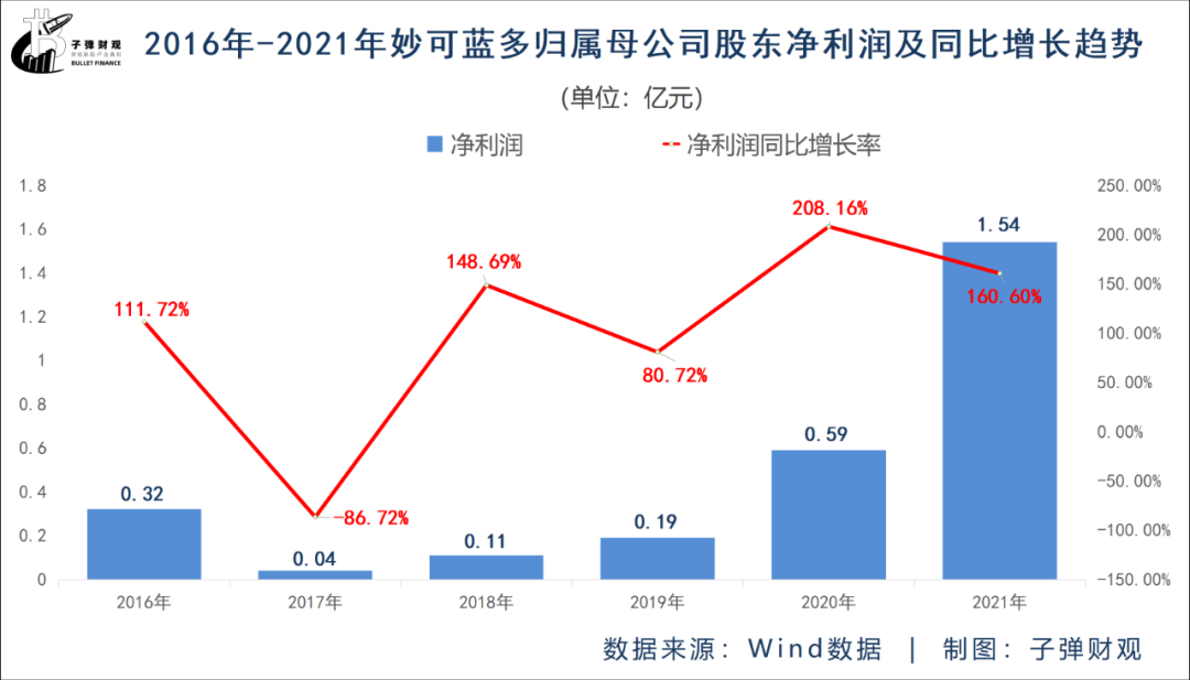 根据妙可蓝多2021年财报数据,公司实现营业收入44.78亿元,同比增长57.31%;实现归属于上市公司股东的净利润1.54亿元 ,同比增长160.60%。