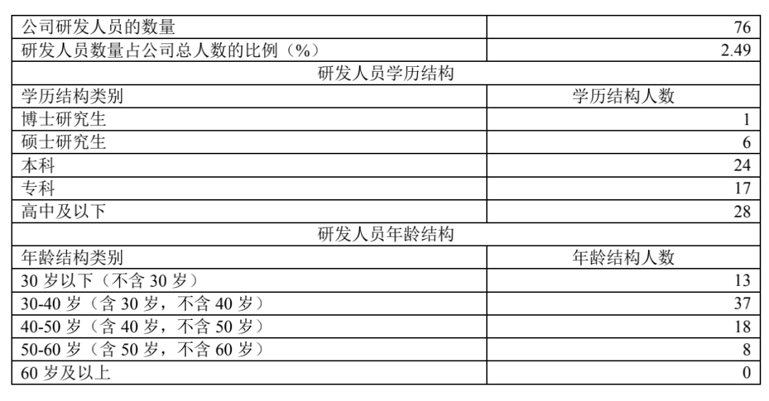 更令人惊讶的一组数据是,截止2021年底,妙可蓝多研发人员数量为76人,占公司总人数的2.49%;且在这些研发人员中,有45人为本科以下学历,占总研发人数的59.21%。