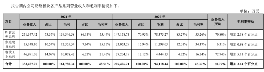 妙可蓝多2021年财报也显示,其在家庭餐桌系列和餐饮工业系列收入仅占奶酪板块营收的10.54%和14.09%,其毛利占比分别为7.64%和6.23%。