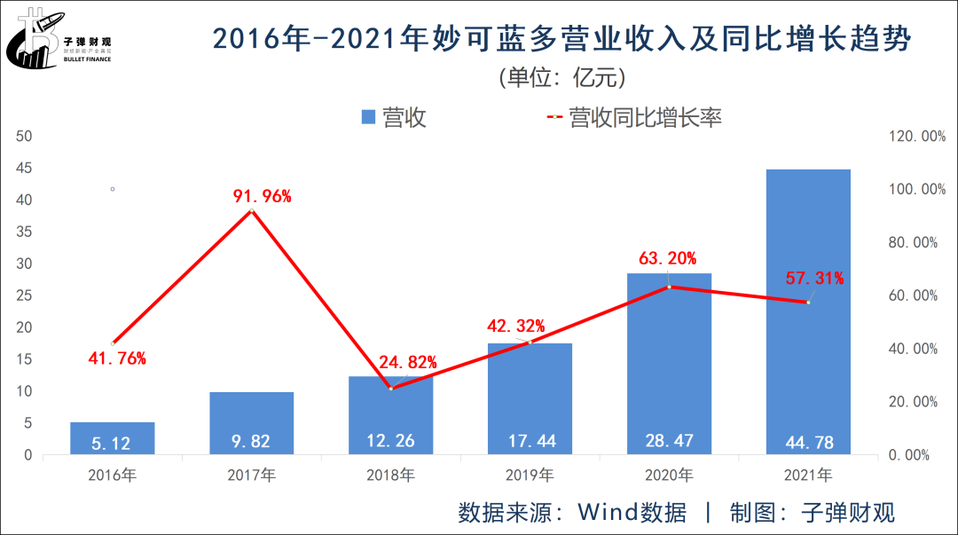 根据Wind数据,从2016-2021年,妙可蓝多营业收入分别实现5.12亿、9.82亿、12.26亿、17.44亿、28.47亿和44.78亿元,同比增速分别为41.76%、91.96%、24.82%、42.32%、63.20%和57.31%。