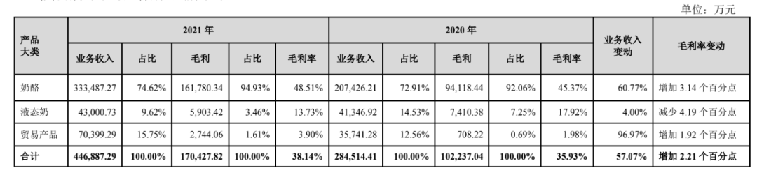 同时,妙可蓝多的主营业务包括奶酪、液态奶和贸易产品,在2021年前述品类分别实现业务收入33.35亿、4.3亿和7.04亿元,占总营收比例为74.62%、9.62%和15.75%;其中,奶酪产品的毛利率最高达48.51%,而液态奶和贸易产品的毛利率仅为13.73%和3.90%。