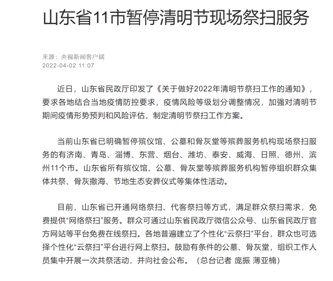 3月8日,海南省海口市早早将即将到来的清明节的祭扫形式改为预约制——分时段预约现场祭扫;3月31日,浙江省宁波市北仑区暂停了今年清明期间线下祭扫活动;4月2日,山东省更是直接暂停了11个市的清明节现场祭扫服务。