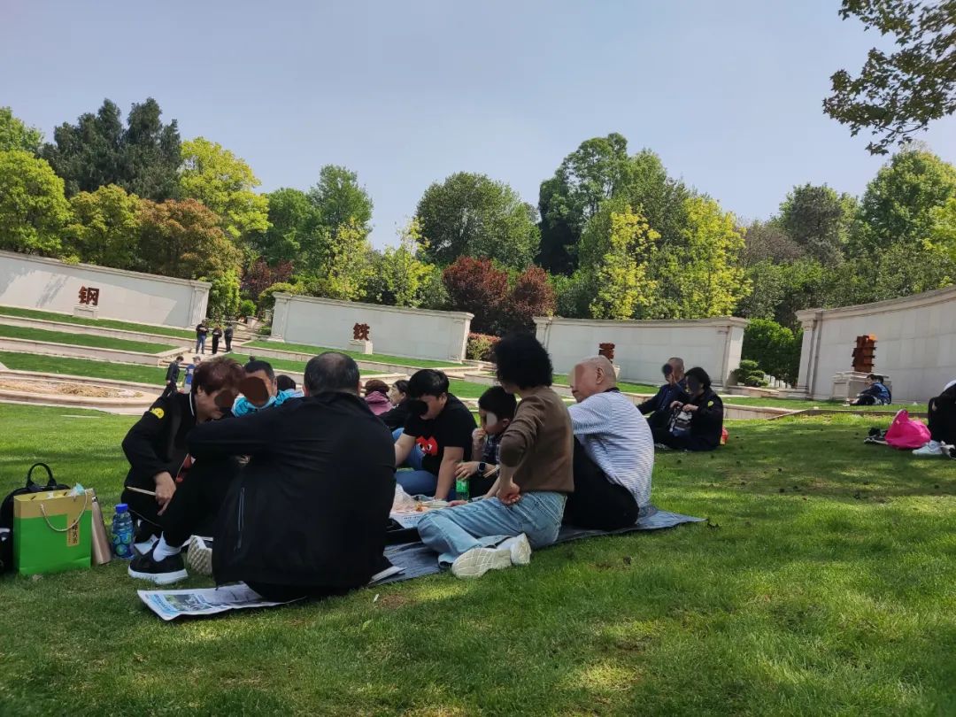 在公园广场草坪上,有些家庭搭起了桌布,由扫墓转向了野营。和往常清明假期一样,“扫墓+春游”成为了三天假期市民最主流的出行方式。