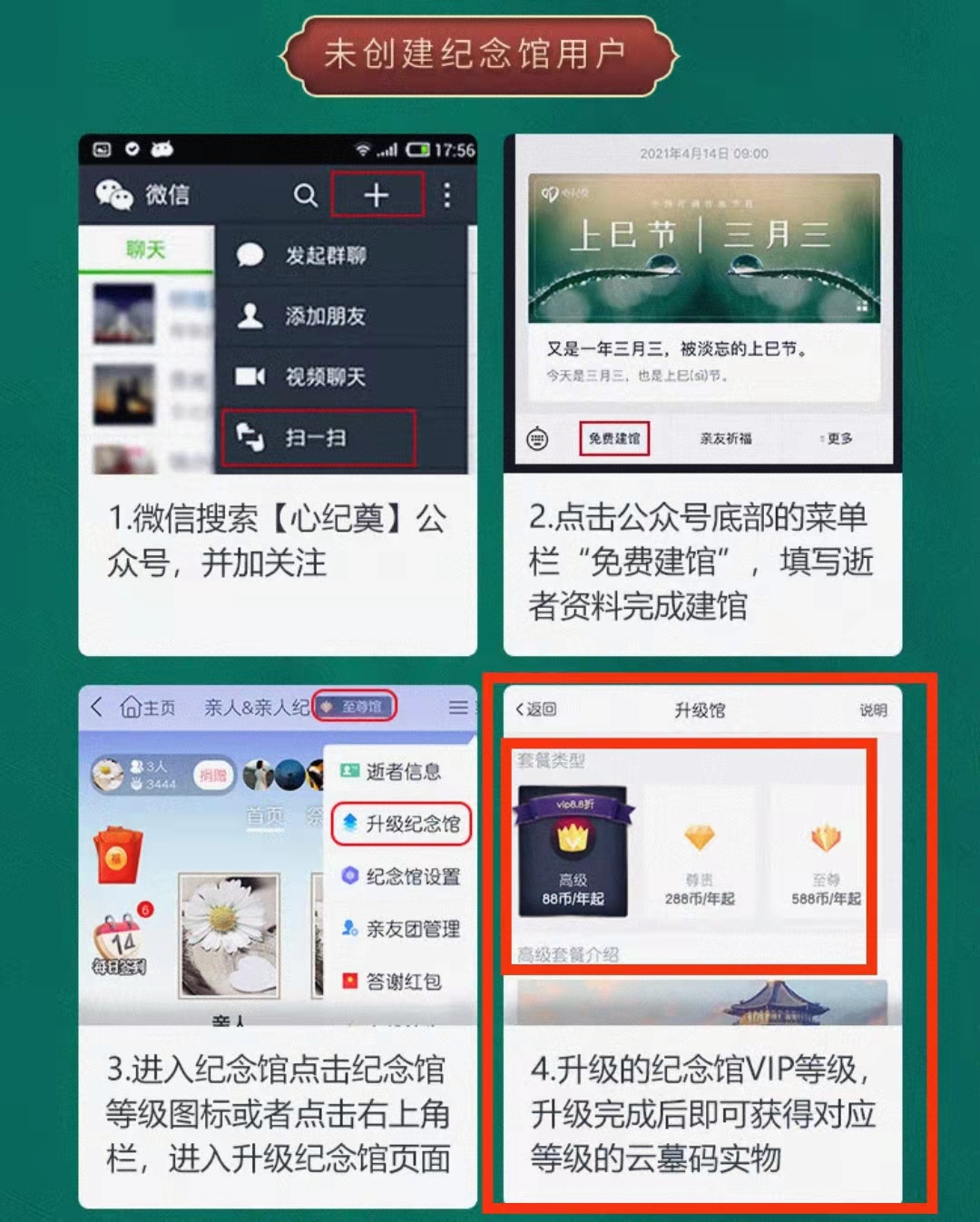 对于这款APP来说,云墓码功能更像是引诱用户升级VIP的诱饵,因为只有是VIP用户,才能升级纪念馆的VIP等级,高级馆88币/年起,尊贵馆288币/年起,至尊馆588币/年起。