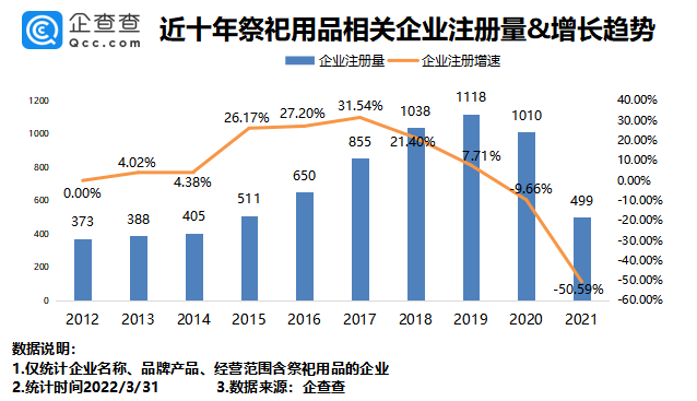 企查查数据显示,2019年是我国新增祭祀用品相关企业最多的一年,新增1118家,同比增长7.71%。2020年新增1010家,同比减少9.66%。2021年更是大幅下降,同比减少50.59%,仅新增499家。