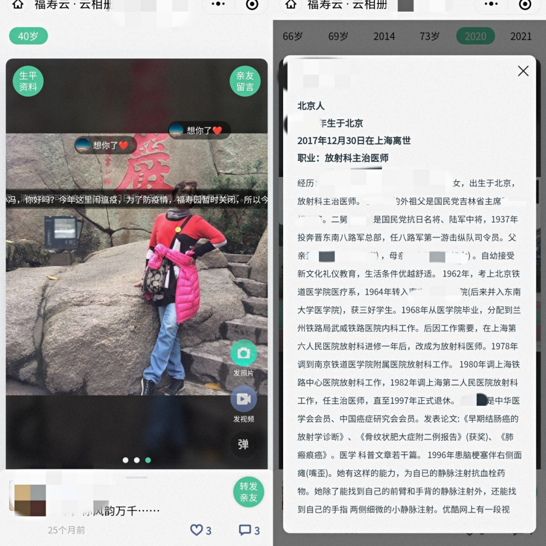 不管是APP还是微信小程序,都有用户上传真实的逝者信息至云端。一款名叫福寿云·云相册的小程序中,有逝者生前从年轻到去世之前的照片视频被逐年展示,生平资料更是与百度百科一般详细。