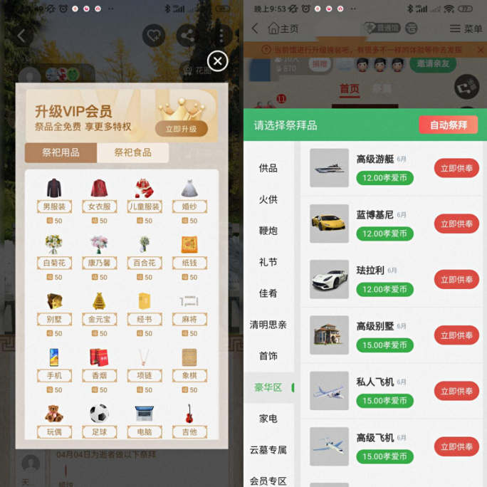 相比较天堂念APP上“时尚包包、项链、香烟”上这些概念化的祭品来说,心纪奠APP上祭拜品还分为豪华区和简单的“香、烛、鲜花、供品”的分区,显然豪华区里高级游艇、兰博基尼、私人飞机需要更多的孝爱币,这样的祭品分区设置更能符合这款APP上的打榜功能。