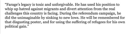 英国绿党领袖Caroline Lucas发表了一番很像悼词的声明,说他留下了一笔“有毒、不可原谅的”遗产,煽动了对移民的“仇恨”,并将因他其“令人恶心”的言行而永远被记住。