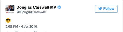 另外,他的党内关系显然也没有搞好。该党在英国议会内的唯一一名议员Douglas Carswell在他辞职后在推特上发了一个表情符号:带着墨镜的得意笑脸。