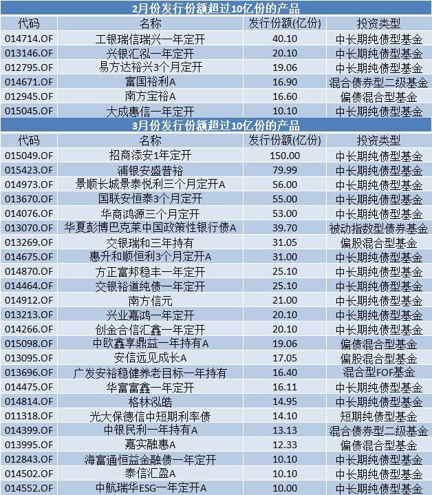 2月份至3月份,主动权益基金发行规模骤降,规模较大的基金多为债券产品。其中,2月份共有6只产品发行份额大于10亿份,5只产品为债券基金,1只产品为偏债混合基金;3月份共有24只产品发行份额大于10亿份,19只产品为债券基金,前5大产品均为中长债,主动权益类基金仅为4只。