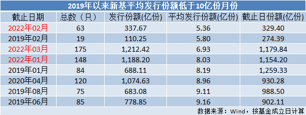 《每日财报》发现,今年一季度新基发行数量虽多,但整体规模较小,导致平均发行份额创近3年来新低。2019年至2022年3月,在39个月份中,共有8个月份平均发行份额低于10亿份,其中今年1-3月全部入列,平均发行份额分别为8.03亿份、5.36亿份和6.93亿份,其中2月份平均发行份额排名倒数第一。