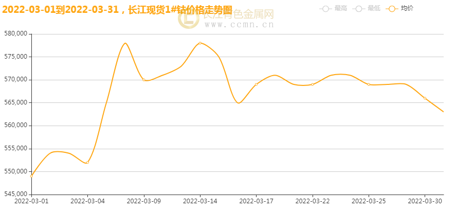 根据长江有色金属网的历史数据显示,尽管3月的钴价较1月和2月的涨势放缓许多,但是整体走势仍然在高位整理运行。截至3月31日,长江现货1#钴均价报563000元/吨,较2月28日的550000元/吨,涨13000元,涨幅2.36%。月内最高点于3月8日和3月14日578000元/吨,最低点于3月1日549000元/吨。