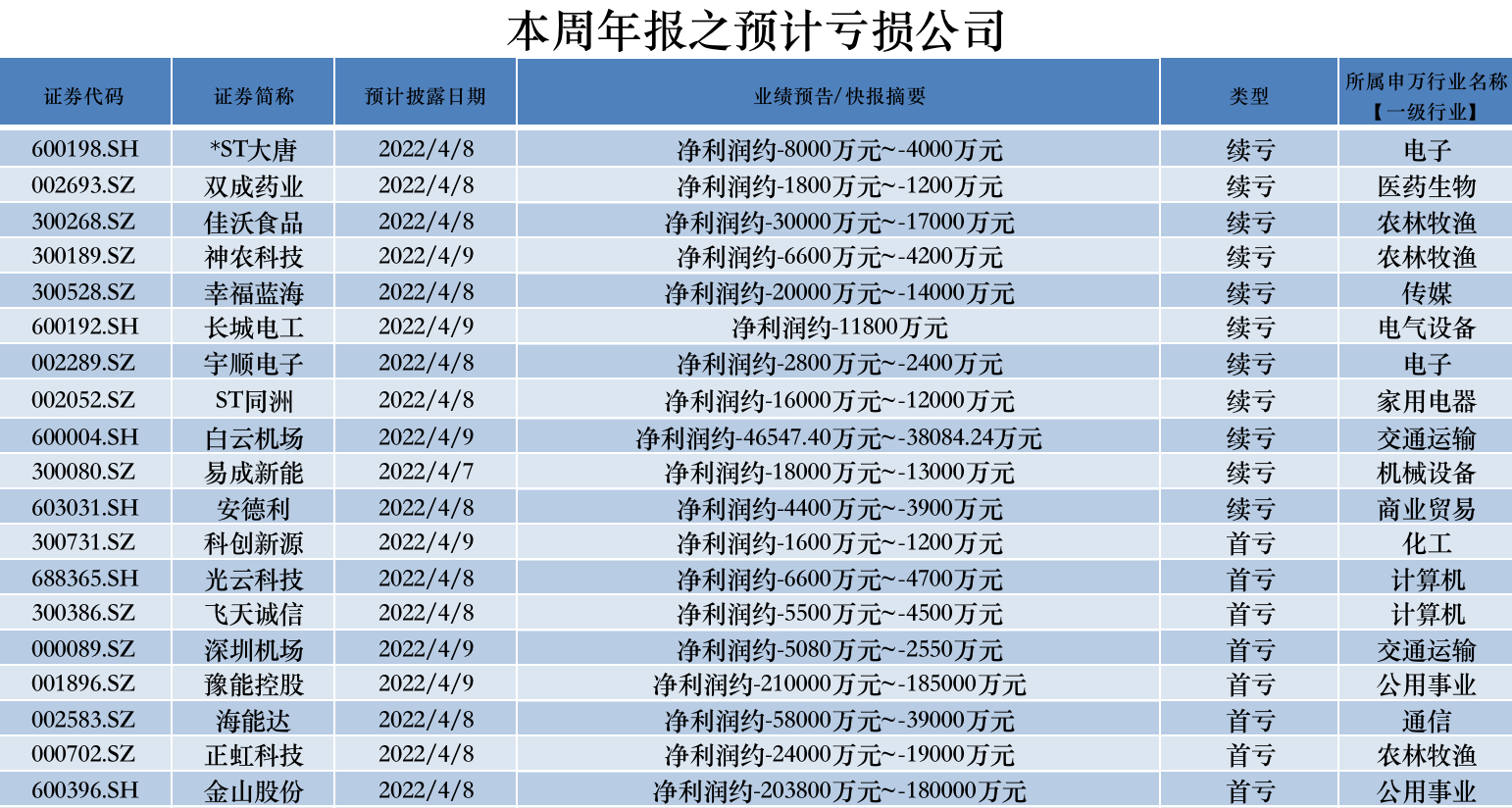本周至少有19家公司将披露亏损的业绩报告。其中*ST大唐(600198.SH)、双成药业(002693.SZ )、佳沃食品(300268.SZ)等11家公司为续亏,科创新源(300731.SZ)、光云科技(688365.SH )、飞天诚信(300386.SZ)等8家公司为首亏。