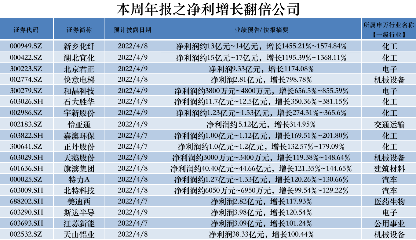 剔除扭亏公司,本周将披露年报的公司中预计净利润增长翻倍的公司共有18家,主要集中在化工、电子、机械设备领域。业绩大增的公司中,大部分公司业绩增长主要原因在于主营业务盈利能力向好,也有少数公司依靠股权投资、非经常性损益项目等取得大额收益。