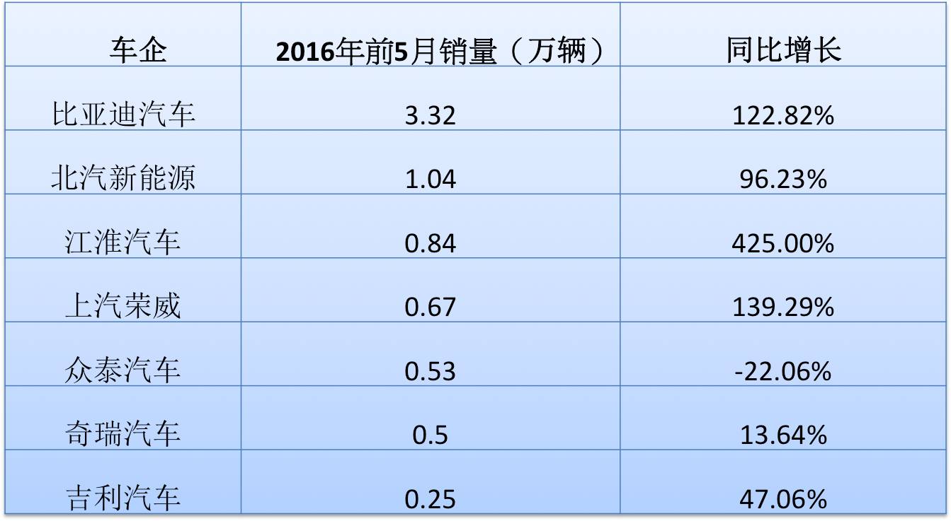 (注:数据来自网络。表中销量为电动+混动车型销量,北汽新能源的产品均为纯电动车型。因其它企业未公布6月销量,表中数据为前5月销量对比。)