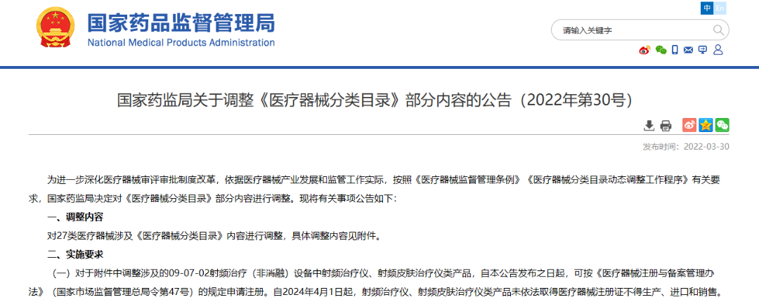比如,在2022年3月28日,国家药监局则发布了关于调整《医疗器械分类目录》部分内容的公告:自2024年4月1日起,射频治疗仪、射频皮肤治疗仪类产品未依法取得医疗器械注册证不得生产、进口和销售。