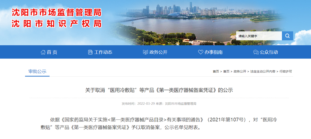 此外,近日C2CC传媒发现,第一类医用冷敷贴也被“整治”了。2022年3月29日,沈阳市市场监督管理局发布了关于取消“医用冷敷贴”等产品《第一类医疗器械备案凭证》的公示,对“医用冷敷贴”等产品《第一类医疗器械备案凭证》予以取消备案。