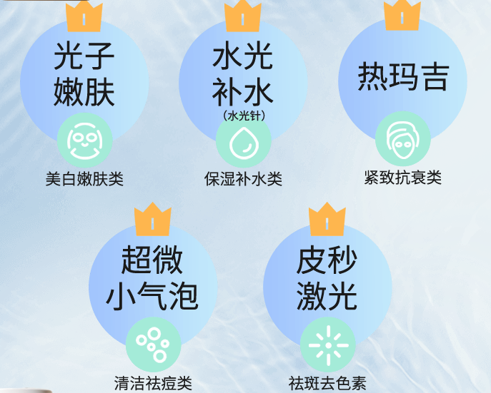 而从肌肤诉求划分的热门医美项目来看,则涉及光子嫩肤、水光针、热玛吉、超微小气泡、皮秒激光。