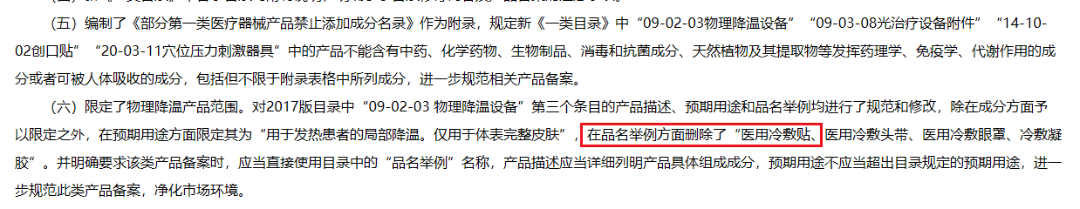 而据国家药监局发布的《第一类医疗器械产品目录》修订说明显示,对2017版目录中“09-02-03物理降温设备”,新修订的目录在品名举例方面删除了“医用冷敷贴”。