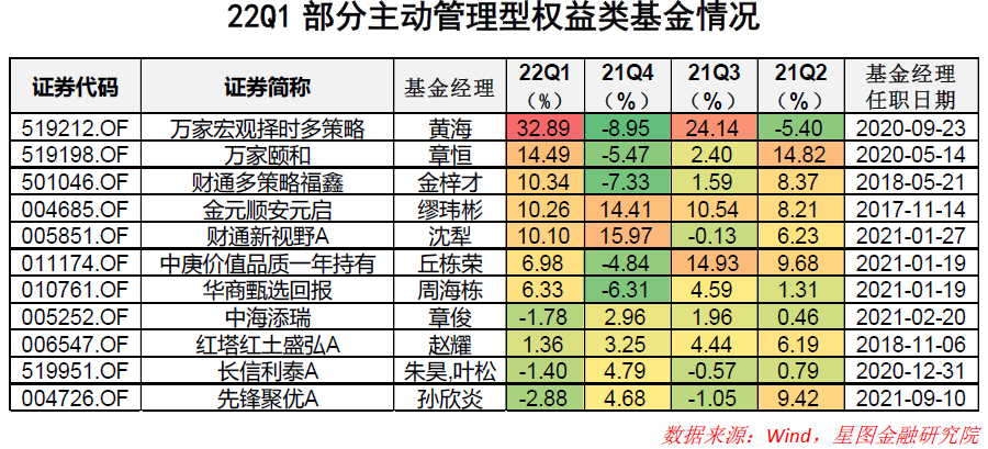 在剔除这些主要受宏观因子影响的基金之外,可以得到一个经过初步筛选的结果。再进一步将其中的被动管理型基金、主题类基金剔除后,可以得到一季度表现较好的主动管理型基金的情况,筛选一季度涨跌幅在-5%以上的主动管理型的权益类基金共有2081只,为了更好地分析这些权益基金业绩的来源,以下将挑选部分进行举例说明。