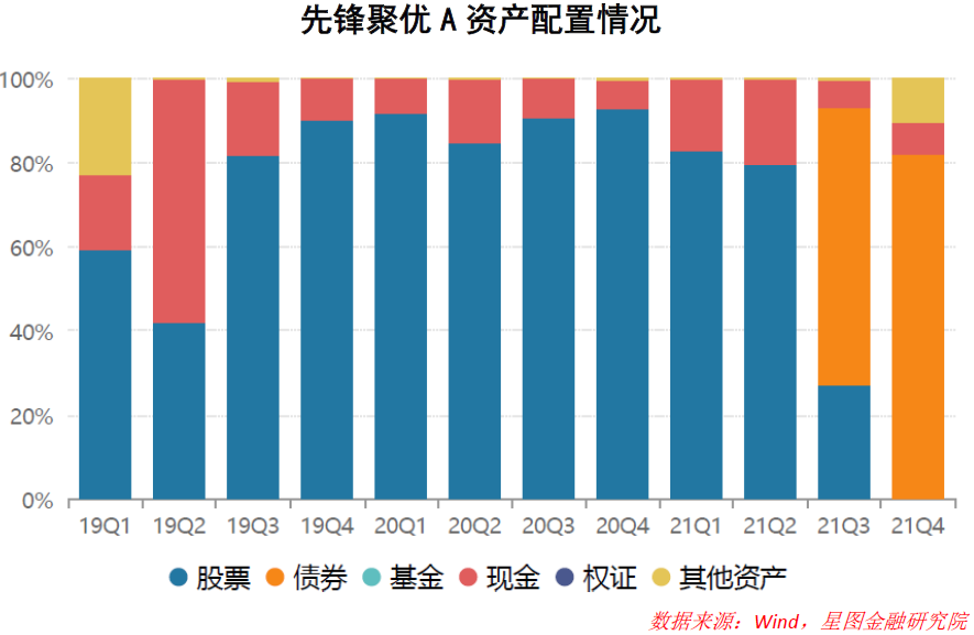 同样的,孙欣炎管理的先锋聚优A也有类似的操作。该只基金在2021年9月份由孙欣炎开始担任基金经理,随后股票仓位从二季度的80%到2021年末的归零。同时增配了近80%仓位的债券。且主要为国债,可以说操作十分大胆且果断。