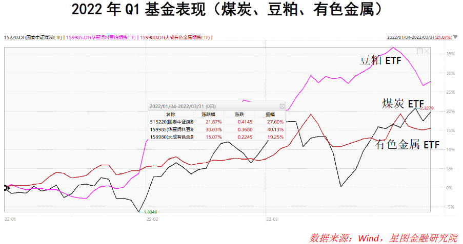 具体来看,第一类是大宗商品类的基金,也是市场中收益表现最好的基金。例如跟踪黄金、原油等商品基金,在避险和能源供给不足的预期下,一季度表现极佳,一季度平均涨幅均超过5%。其他如跟踪豆粕、煤炭、有色金属等商品的基金,表现则更加突出,涨幅均超过15%。