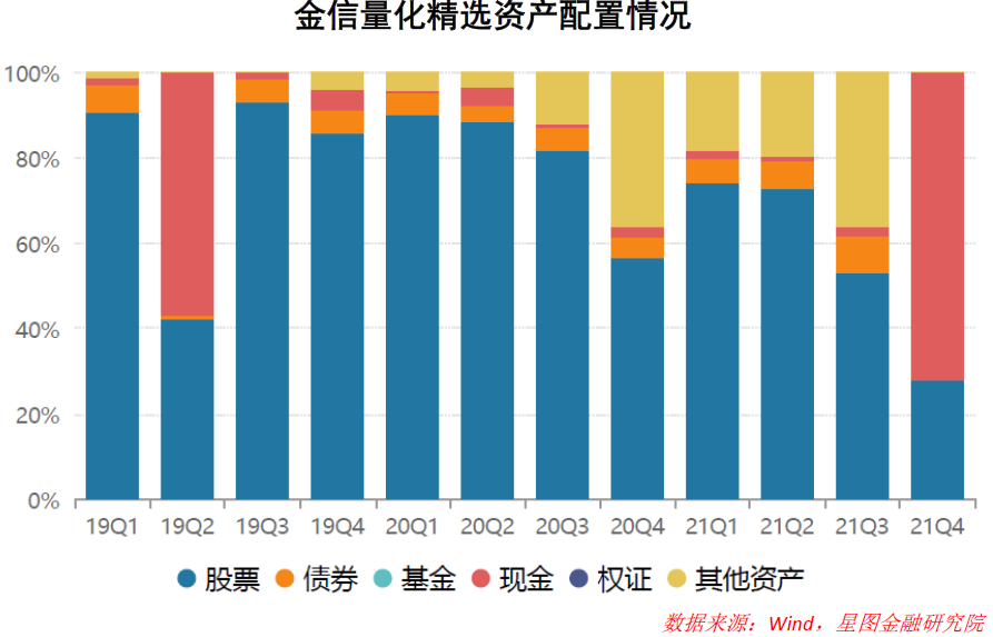 第三类则是我认为非常值得关注的一种,通过降低权益仓位,调整股债的仓位分布,或降低权益增加现金。代表性的基金经理有金信基金的周谧、先锋基金的孙欣炎等。他们在管理的基金中都在去年的四季度有相似的操作,即大幅度降低股票的仓位,持有现金或增持债券。以周谧管理的金信量化精选为例,从中可以看出,从2021年第三季度到第四季度,股票仓位从50%多下降到了不到30%,并持有了大量的现金,低仓位能够很好地降低净值的波动,同时也有利于大跌之后重新提高权益资产的仓位。