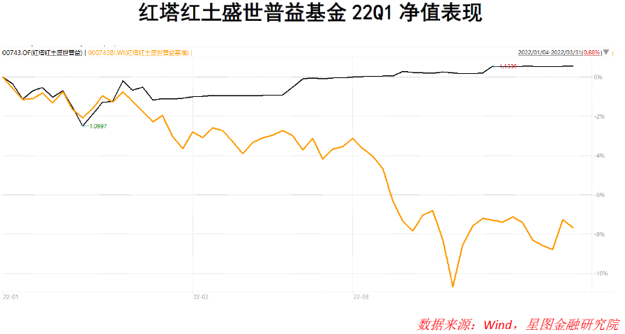 最后一类一季度表现较好的基金则比较复杂。从其公布的2021年末持仓来看,净值应该与市场同步大跌,但净值实际表现却较好。因此,这些基金大概率是在2022年一季度对持仓进行了大幅度的调整,因此表现迥异。以吴秋松管理的红塔红土盛世普益(000743.OF)为例,今年一季度实现了0.88%的正收益,表现大幅度优于其基准指数。