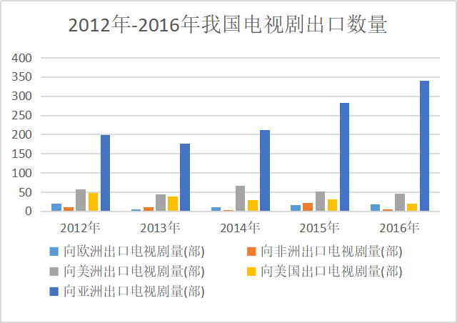一是在信息触达上极其有限,我国当前的电视剧传播主要还是在亚洲地区传播,其他地区的受众量很少。以国家统计局公布的2012年-2016年的我国电视节目出口量为例,我国向亚洲地区的出口电视剧数量平均在200部以上,呈逐年增高趋势,而向欧洲、美洲、非洲、大洋洲出口的数量只有几部到几十部不等,并没有明显的增长。同时,在亚洲地区中,向东南亚国家出口电视剧数量远多于韩国、日本。