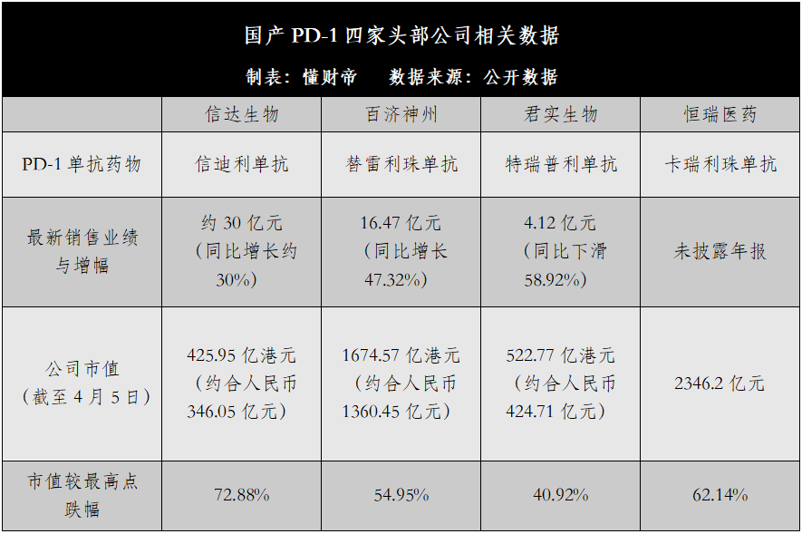 2021年财报显示,信达生物旗下信迪利单抗销售业绩约为30亿元,同比增长约30%,百济神州旗下替雷利珠单抗中国区销售额为16.47亿元,同比增长47.32%,君实生物旗下特瑞普利单抗销售额为4.12亿元,同比下滑58.92%。