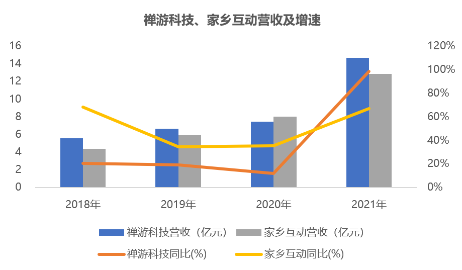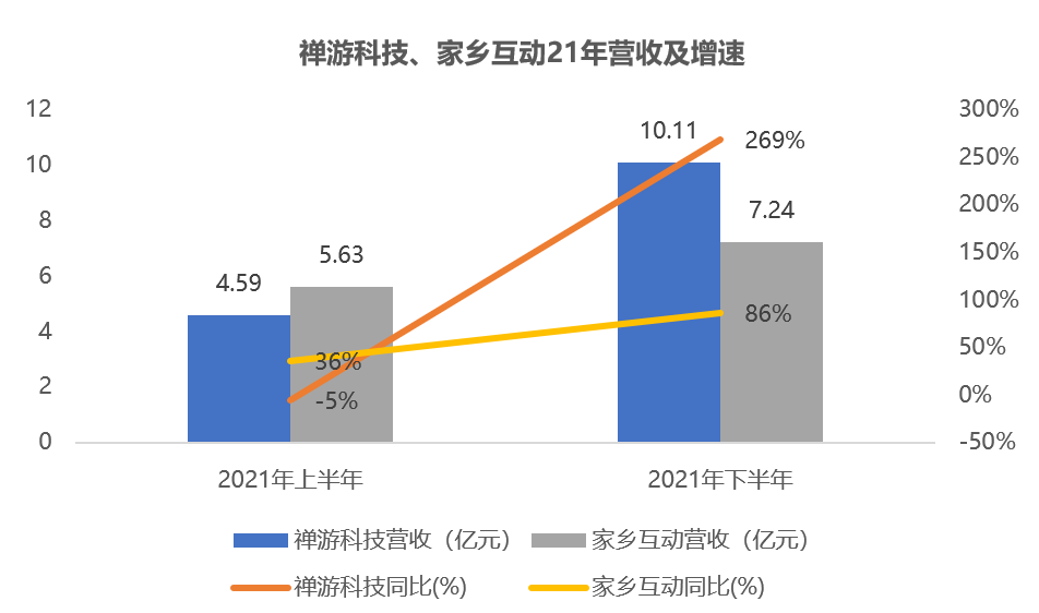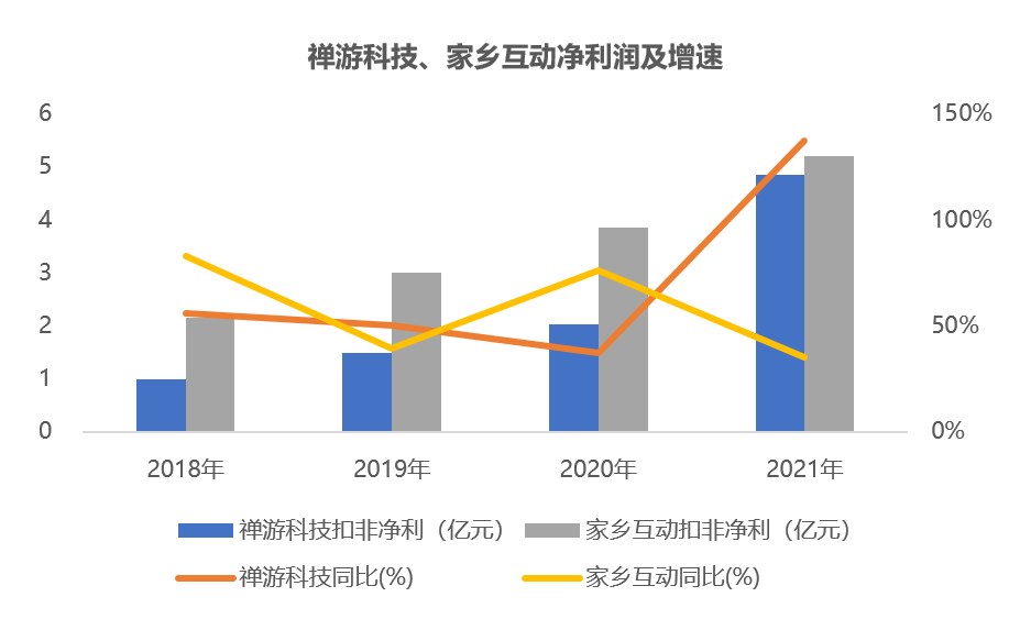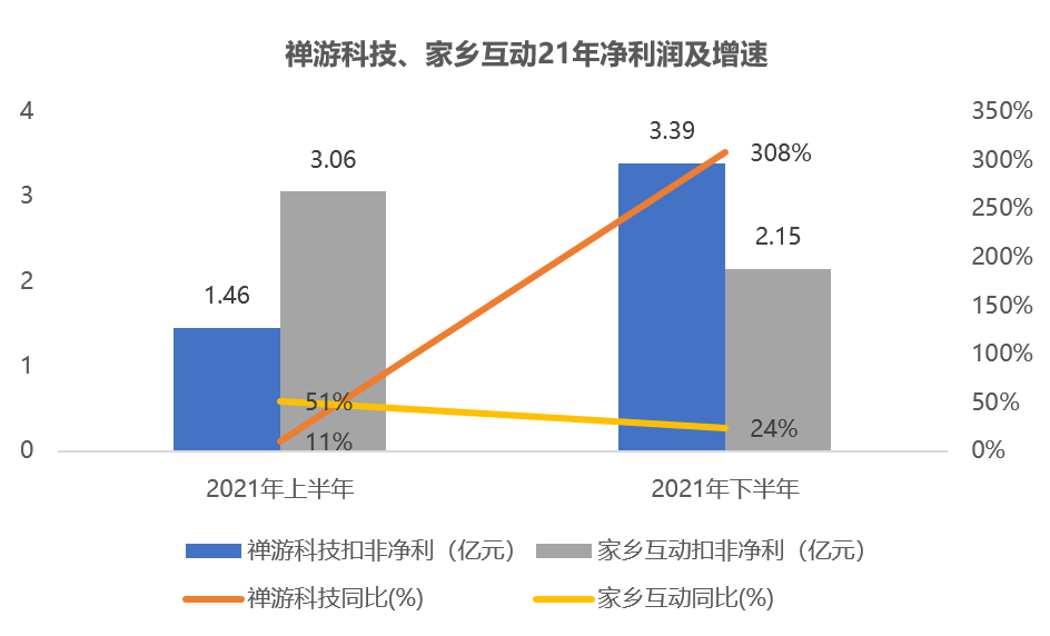 禅游科技21年营收翻倍达14.7亿元,扣非归母净利润达4.85亿元,增幅超130%;家乡互动营收达12.87亿元,增幅将近70%,扣非归母净利润达5.21亿元,增幅超30%。