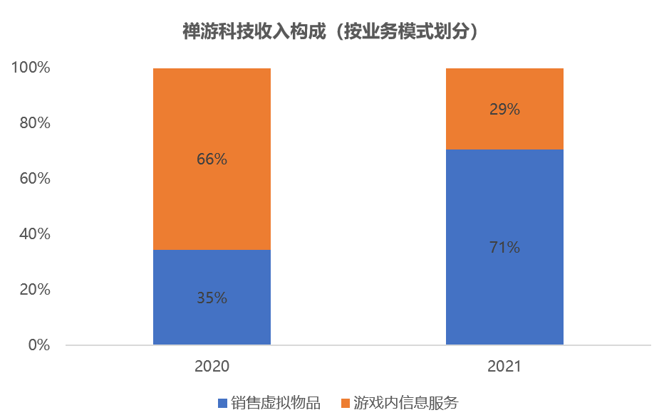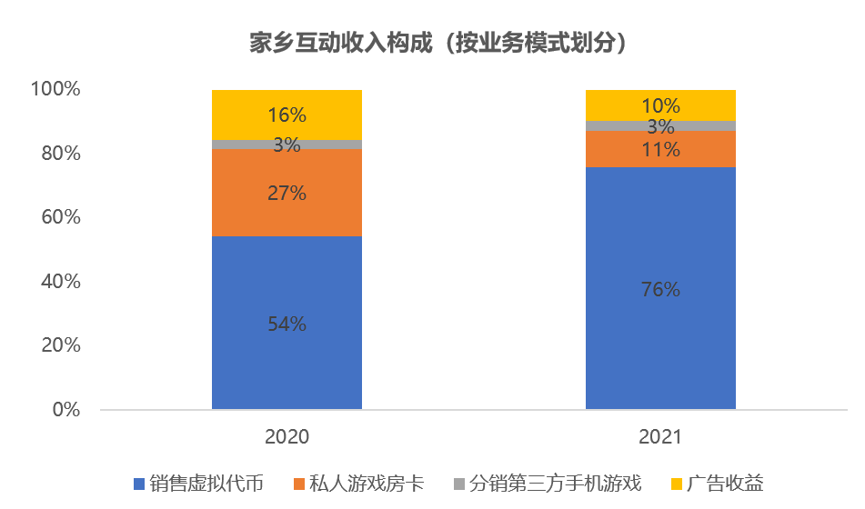 21年,禅游科技内购收入占比达到7成,同比增幅超300%,家乡互动内购收入(销售虚拟代币+私人游戏房卡)占比达到87%,较20年提高了5个百分点。