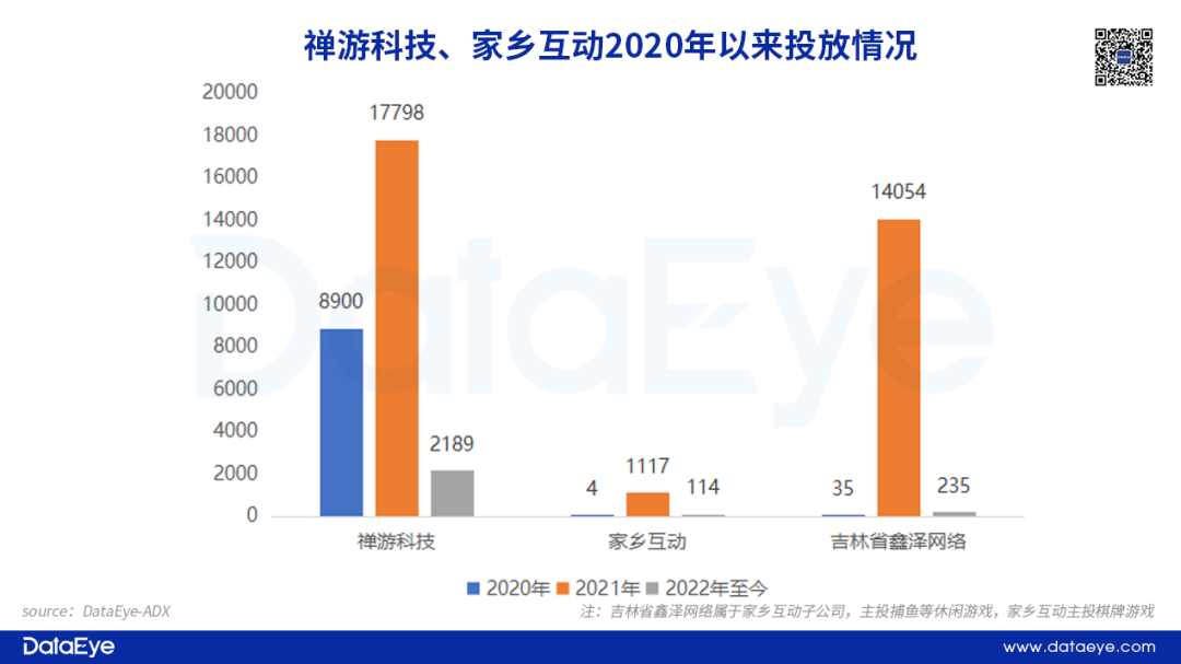 22年以来,两家公司投放力度大减,禅游2022年至今投放素材量仅达到21年的1/10左右,家乡互动子公司吉林省鑫泽网络投放量不到21年全年的2%。