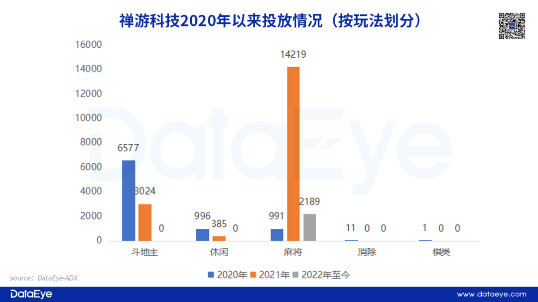 从游戏玩法来看,禅游20年重点投放斗地主游戏,21年转而押注麻将游戏,麻将游戏占据80%以上的素材总量,斗地主游戏投放占比降至20%以下。22年以来,禅游更加聚焦,2000多组投放素材全部押注麻将游戏。