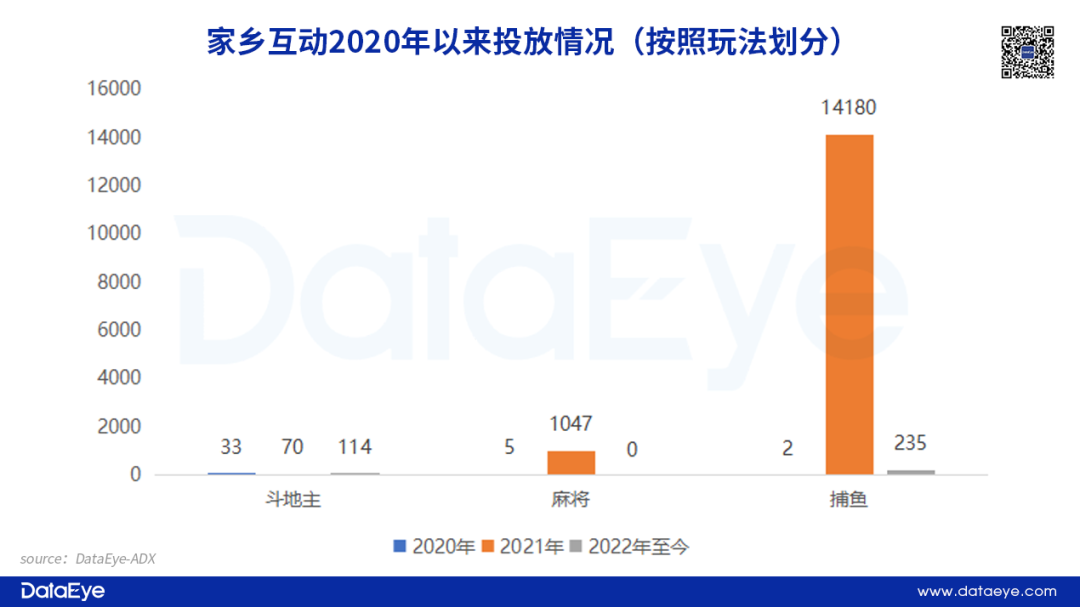 家乡互动20年投放量较低,数据参考价值不大,21年重点押注捕鱼赛道,超过90%的投放素材投到了这个赛道,其余素材投向麻将游戏。22年以来,家乡互动只投放了捕鱼和斗地主游戏,麻将游戏没有投放。
