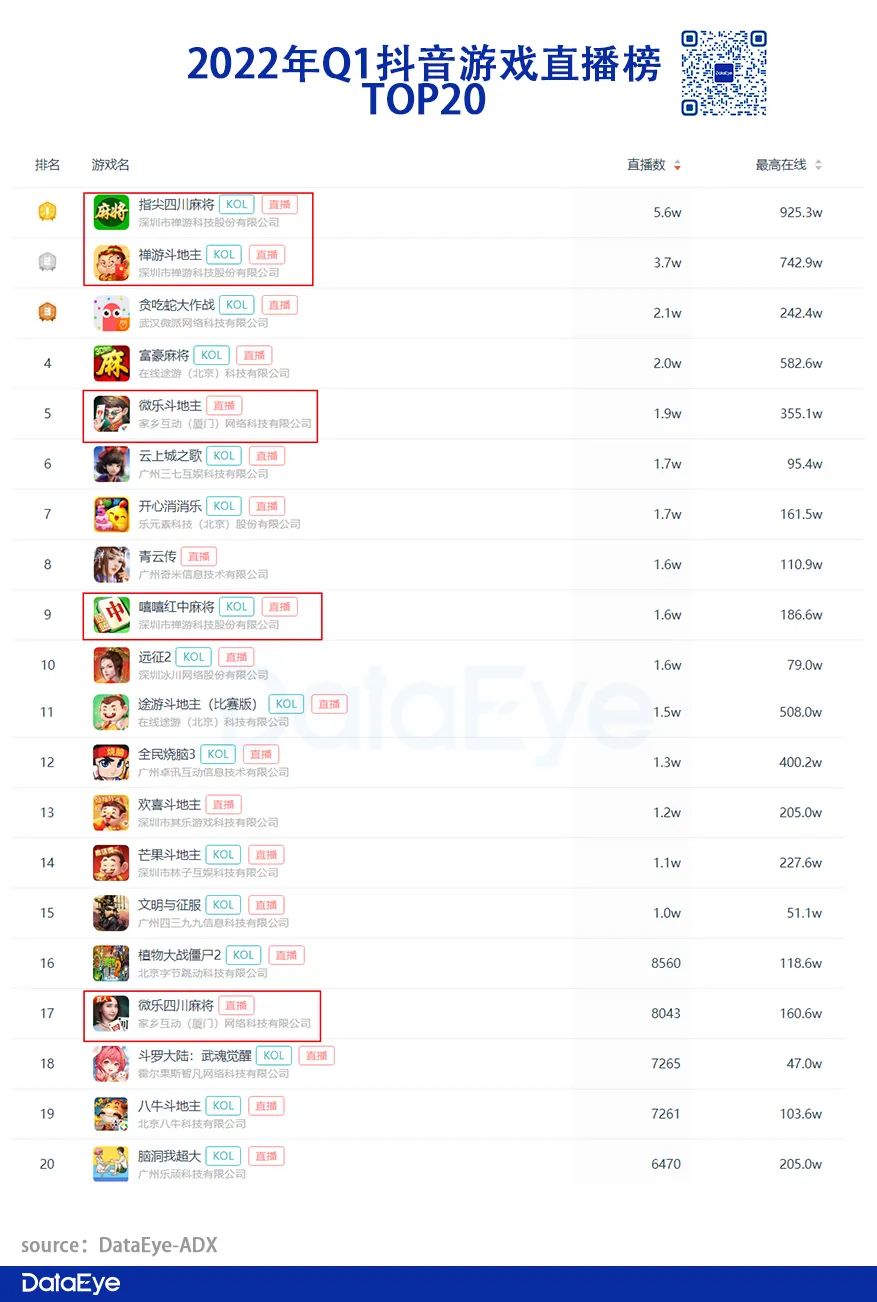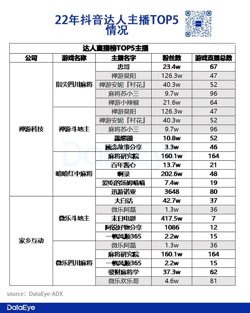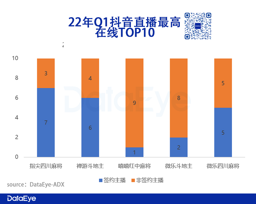 从直播效果来看,根据DataEye-ADX后台监测的数据显示,五款游戏达人直播榜TOP10的主播一半以上系公司签约主播,其中《指尖四川麻将》签约主播几乎包揽直播榜TOP10。这说明两家公司旗下签约主播已经扛起了公司直播的大旗。