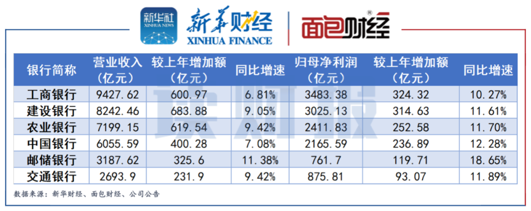具体来看,工行和建行的营收及归母净利润均排在前两位,净利润均超3000亿元。从增速看,所有六家银行净利润同比增长均超过10%,且利润增速均超过营收增速。