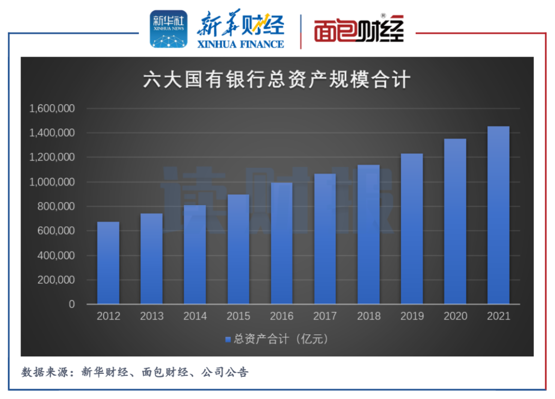 截至2021年末,六大国有银行总资产规模合计达145.47万亿元,较上年末增加103346.58亿元,增幅为7.65%。近10年来,国有银行整体资产规模持续扩张。
