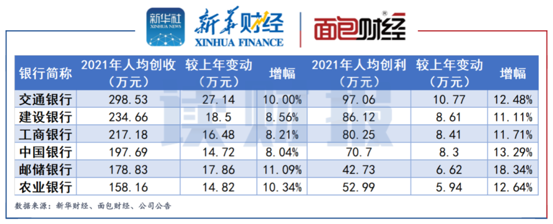 与2020年相比,人均创收方面,邮储银行人均创收增加17.86万元,同比增长11.09%,增幅排名第一;其次是农业银行和交通银行,较2020年分别增加14.82万元和27.14万元,同比分别增长10.34%和10%,增幅分列第二和第三位。