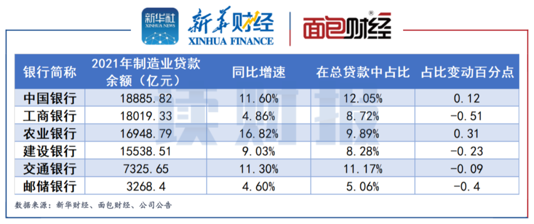 与2020年相比,6家国有银行的制造业贷款余额均有不同程度增长,但是有4家银行的制造业贷款在总贷款中的占比普遍有所下降。