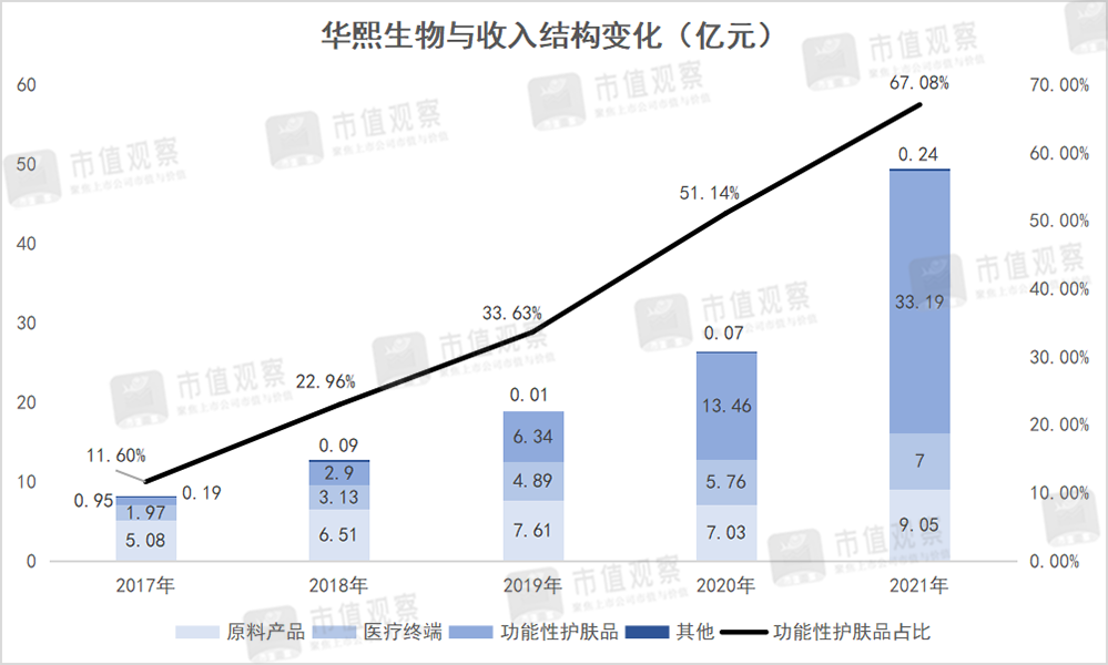 功能性护肤品的成功转型,短暂对冲了华熙生物在玻尿酸原料业务上的停滞不前与玻尿酸医美终端产品的布局落后的局面。