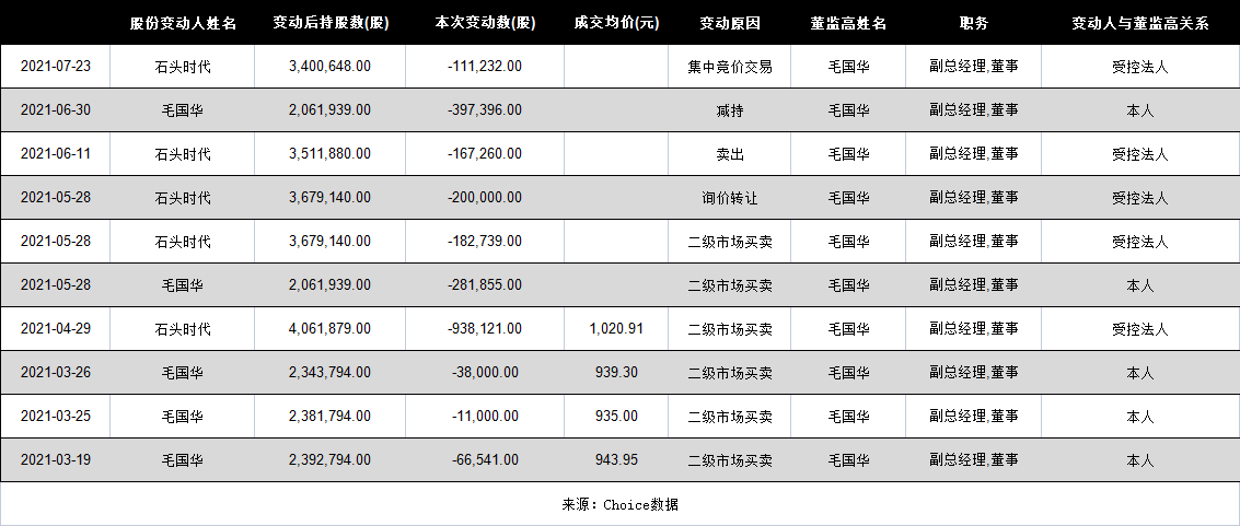毛国华的减持分为个人持股减持以及通过石头时代这个员工平台进行减持。根据Choice数据,2021年,毛国华累计减持10次,累计减持239.41万股,占公司总股本3.58%。