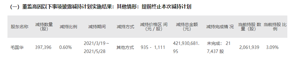 个人的减持计划确实停止了,但这并不影响毛国华通过石头时代继续减持,6月11日,石头时代减持16.73万股,减持人便是毛国华。若以减持价格上限每股1472.88元估算,毛国华套现2.46亿元。