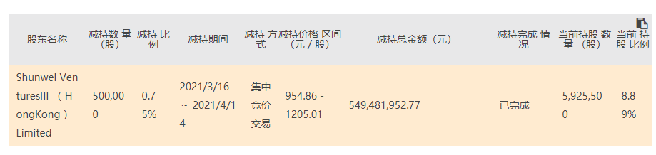 在首轮减持中,顺为资本仅用半个月时间就完成了减持计划,顺为资本总共减持50万股,总减持金额为5.49亿元。