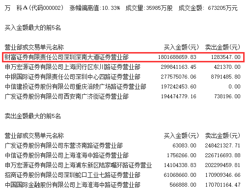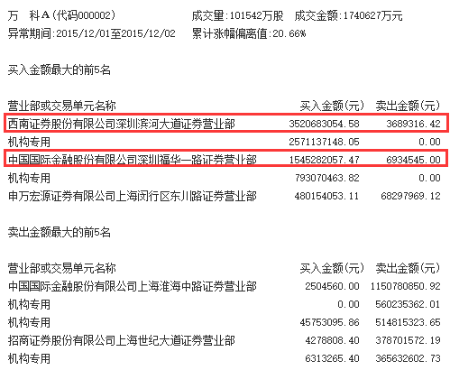 然而,上述席位与宝能系惯用席位并不一致。界面新闻通过对比2015年底抢筹万科A的龙虎榜席位和“宝能系”增持时间点发现,财富证券深圳深南大道、西南证券深圳滨河大道、中金公司深圳福华一路较大概率为“宝能系”资金的营业部席位,这些席位上榜时均出现了10亿元以上的增持资金。但这次,这些营业部席位均未出现在龙虎榜中。