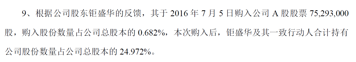 万科A夜间公告称,根据公司股东钜盛华的反馈,其于2016年7月5日购入公司A股股票75,293,000股,购入股份数量占公司总股本的0.682%,本次购入后,钜盛华及其一致行动人合计持有公司股份数量占公司总股本的24.972%。