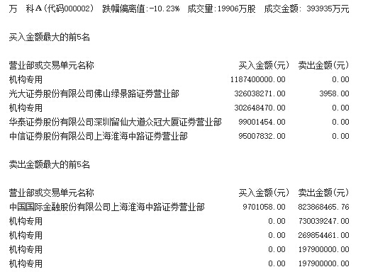 卖出万科A的资金则几乎全部来自机构,占据卖二至卖五席位,金额分别为7.30亿元、2.70亿元、1.98亿元、1.98亿元,合计13.96亿元。仅有中金公司上海淮海中路为普通席位,位列买一,该席位一直被市场解读为QFII大本营,5日卖出金额8.24亿元,但同时买入970.11万元。
