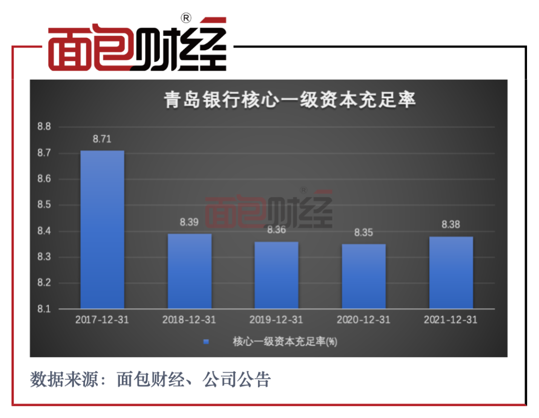 数据显示,截至2021年末,青岛银行的核心一级资本充足率为8.38%,虽较上年末微提0.03个百分点,但仍然低于行业平均水平。