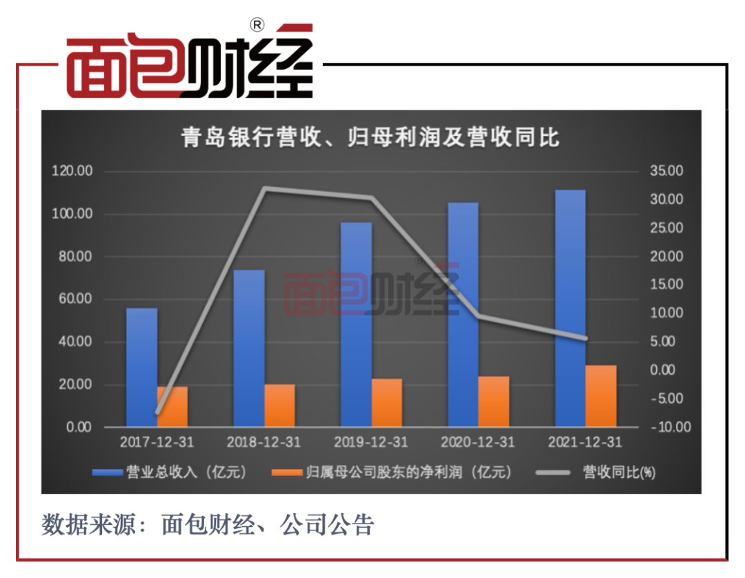 2021年,青岛银行实现营收111.36亿元,归母净利润29.23亿元,同比增长22.08%。